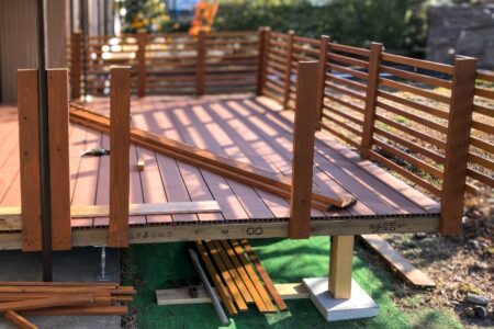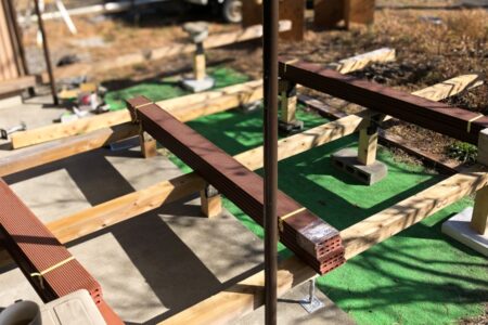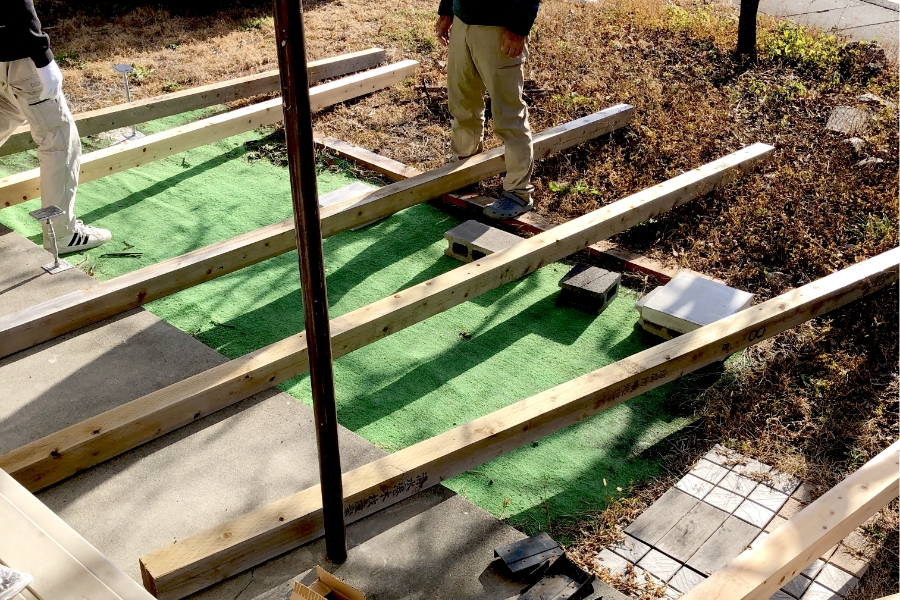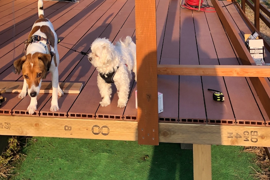 既存の犬走りを活かしつつ、メンテナンス性に優れた人工木ウッドデッキを新設。