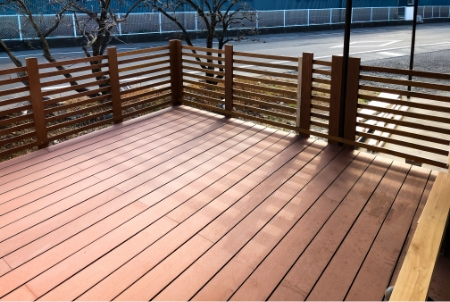既存の犬走りを活かしつつ、メンテナンス性に優れた人工木ウッドデッキを新設。